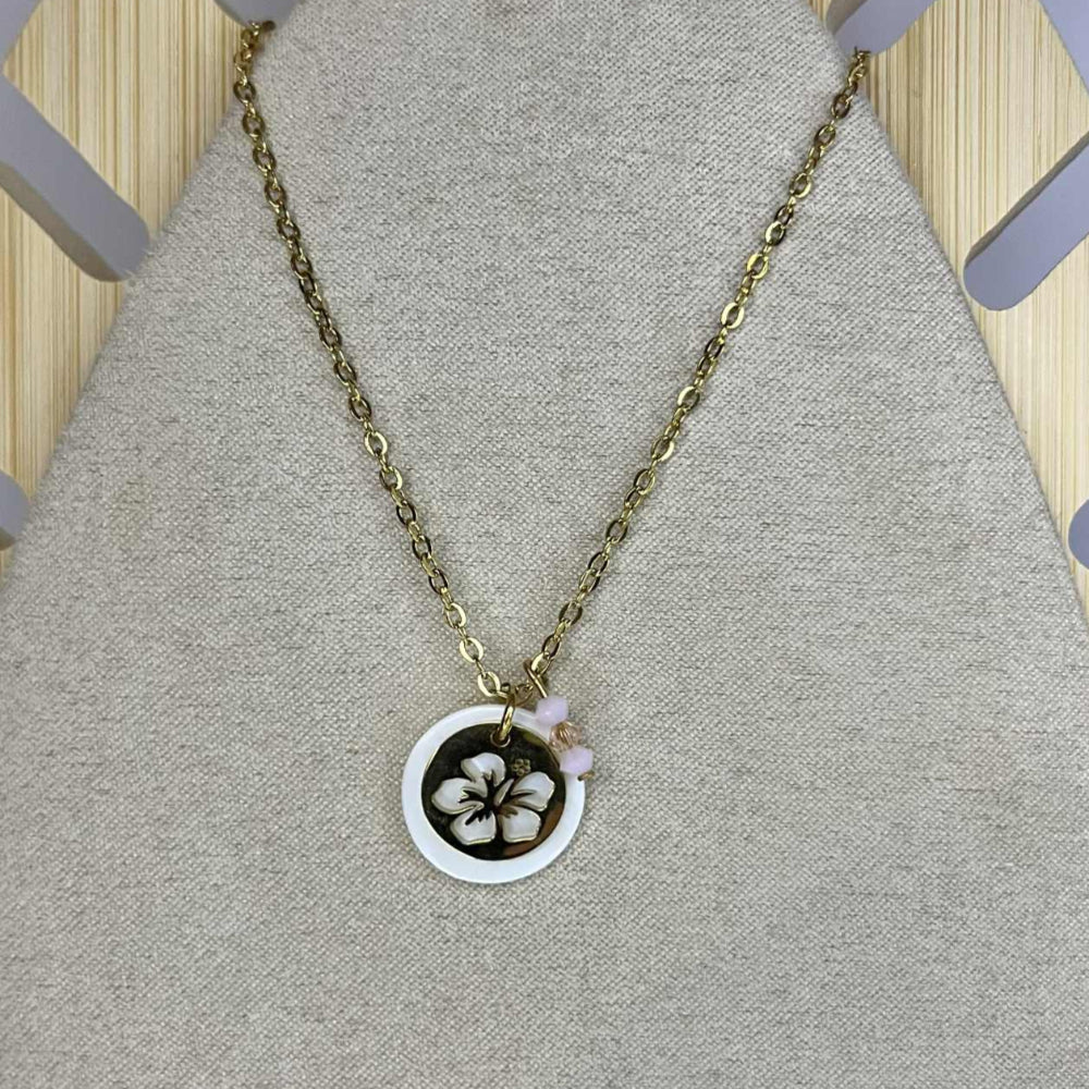 Collier est composé d'un pendentif Hibiscus, d'un sequin en nacre et des perles roses.