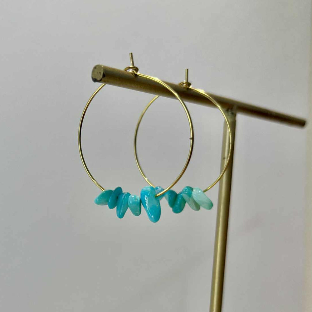 Boucles d’oreilles créole avec ses perles de coquillages, teintés dans les tons bleus.